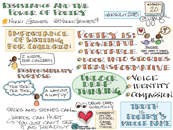 Resistance and the Power of Poetry from @NikkiGrimes9 #KSULit2018 The importance of writing for children: Voice, Identity, Compassion Share this: Share on X (Opens in new window) X Share on Facebook (Opens in new window) Facebook Share on LinkedIn (Opens in new window) LinkedIn Share on Mastodon (Opens in new window) Mastodon More Share on Tumblr (Opens in new window) Tumblr Email a link to a friend (Opens in new window) Email Share on Pinterest (Opens in new window) Pinterest Share on Reddit (Opens in new window) Reddit Like Loading... March 20, 2018 0
